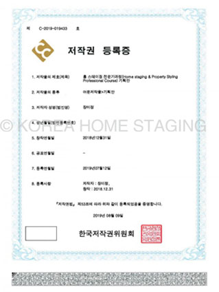 | 제목 | [2019-08-09] 한국홈스테이징 저작권 등록 <홈스테이징 전문가과정> | 작성일 | 2020-12-06 15:40 |