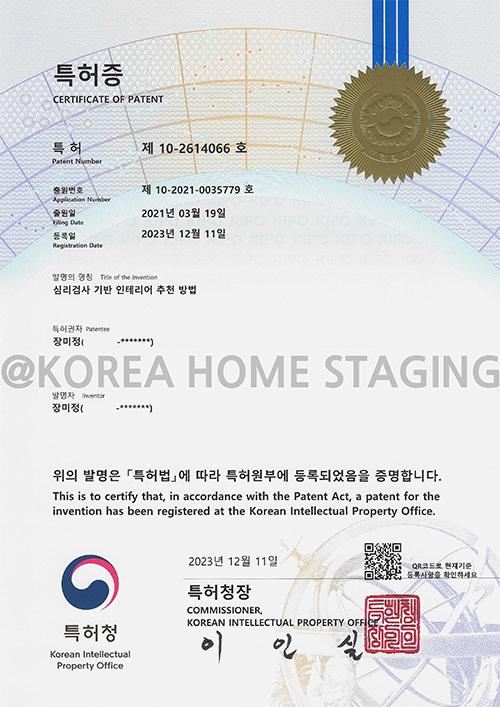 지난 4년 간의 연구와 실험을 통해 2020년 출원한 <심리검사 기반 인테리어 추천 방법>이